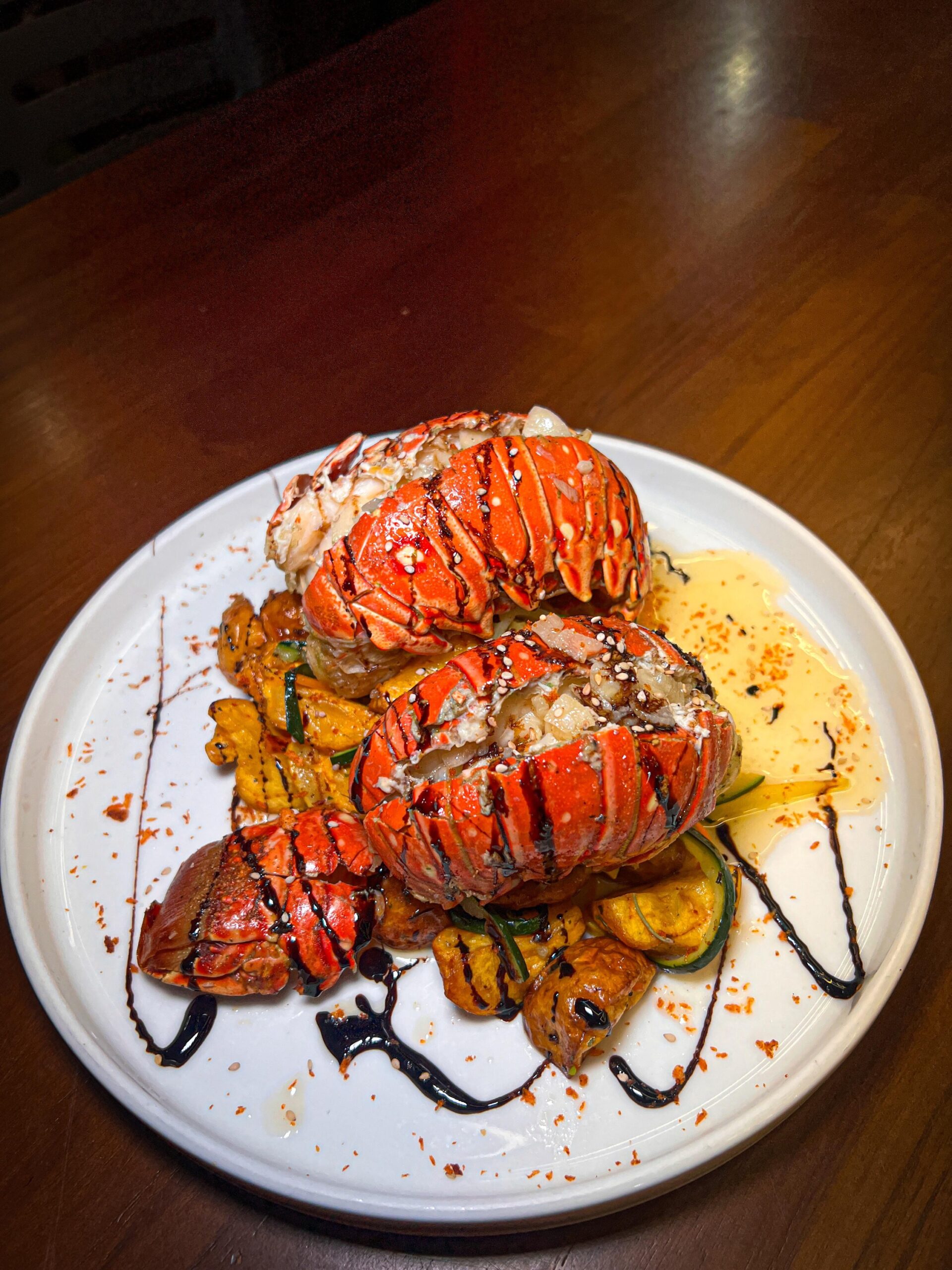 Cola de langosta al ajillo acompañada con papa criollas y vegetales salteados a las finas hierbas